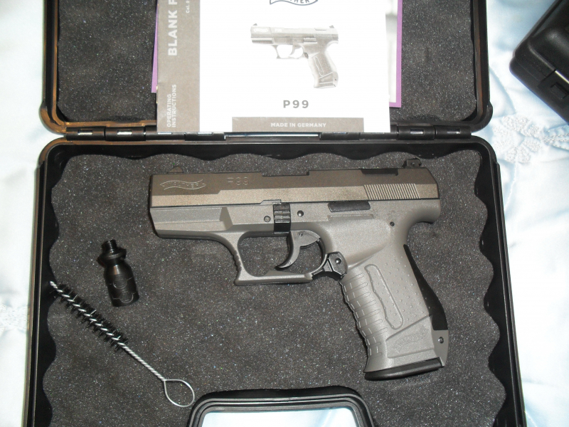 Versteigere aus Sammelauflösung Walther P 99 mit Stahlverschluss in Grey . 9mm PAK ,mit Koffer ,Abschussbecher Anleitung und Reinigungsbürste.