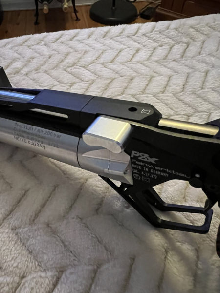 Feinwerkbau P8X Ladehebelknopf aus Aluminium. Ersetzt das einzige Teil der FWB Matchluftpistole aus Plastik . . . inclusive 2 passende Schrauben (alle Farben, Silber, Schwarz, Rot, Blau, Orange, Gold) also abgestimmt auf jede Patrone, eloxiert, gefast und professionell gefertigt! Ein Muss für jeden P8X Sportsfreund egal ob Privat im SV oder Wettkampfklasse, der wertige Ladehebelknopf gehört einfach an jede Feinwerkbau P8X !! Bitte nach der Auktion die Farbe mitteilen!! Silber, Schwarz, Blau, Orange, Gold, jeder Ladehebelknopf ist 1 x vorhanden. Rot = verkauft !! Na dann viel Spaß beim Bieten, aber bitte keine Spaßbieter .