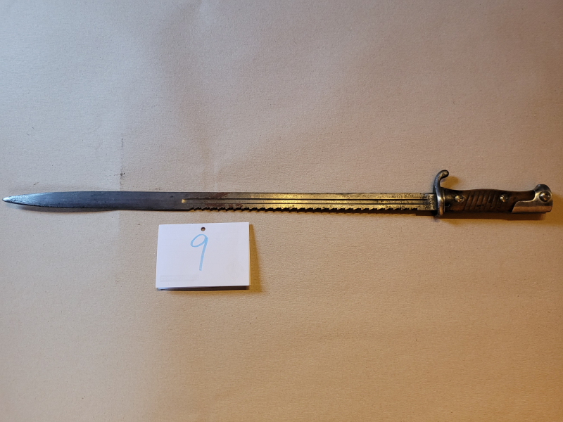 Original Deutsches Sägemesser Bajonett, Länge 65 cm, Hersteller ERFURT, mit Klingenrücken Prägung Krone W04, wahrscheinlich noch von vor dem 1. Weltkrieg. Leichte Flugrostspuren.