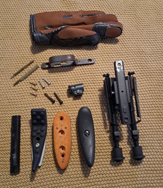 Hallo und guten Tag. Unter den Hammer kommt dieses Konvolut, original Feinwerkbau Schaftkappe, Tuning Schaftkappe, Fieldtarget, Zweibein, Schiene zum Erhöhen eines Diopter oder Zielfernrohr. Original Korntunnel, wahrscheinlich Feinwerkbau oder Anschütz, passt aber auch bei Diana. Bissl kleinkram und ein Schützenhandschuh ( links ) viel spaß beim bieten.
