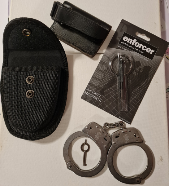 Sie bieten auf eine original Smith&Wesson Handfessel mit einem dazugehörigen kleinen Schlüssel, einem Handfesselschlüssel lang (in original Verpackung ), eine neue Handfesseltasche aus Cordura, sowie eine Funkgerätehalterung für den Gürtel. Handfessel und Fungerätehalterung waren in Gebrauch und weisen entsprechend Gebrauchsspuren auf. Ich versende ausschließlich als versichertes Hermes Päckchen.Bei Fragen melden Sie sich gerne.