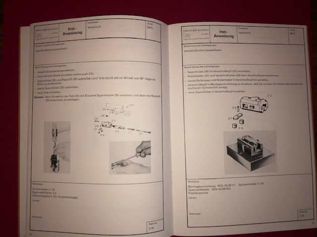 Original MP5 / MP5k / MP5 SD Heckler&Koch Oberndorf Instandsetzungsvorschrift für Waffentechniker, 51 Seiten, 8 Seiten Wartung, Pflege und Fristenplan, danach detaillierte Instandsetzungsanweisungen für alle Baugruppen. Teilezeichnungen und Sonderwerkzeuge, selten