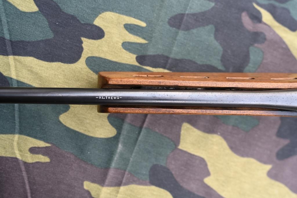 Kaliberbezeichnung "CAL. 308 WIN.", bundesdeutscher Beschuss Adler über„N“, datiertes Beschussdatum „3  86" (= März 1986), Herstellerangabe "Kl. Thews" auf der Laufoberseite und Modellbezeichnung "Mod. 98" auf der Hülse links, wie vom Karabiner 98 noch gewohnt: Hier wurde seinerzeit ein altes Wehrmachtssystem verbaut! Seriennummer "87605" bzw. "05" auf Kleinteilen.