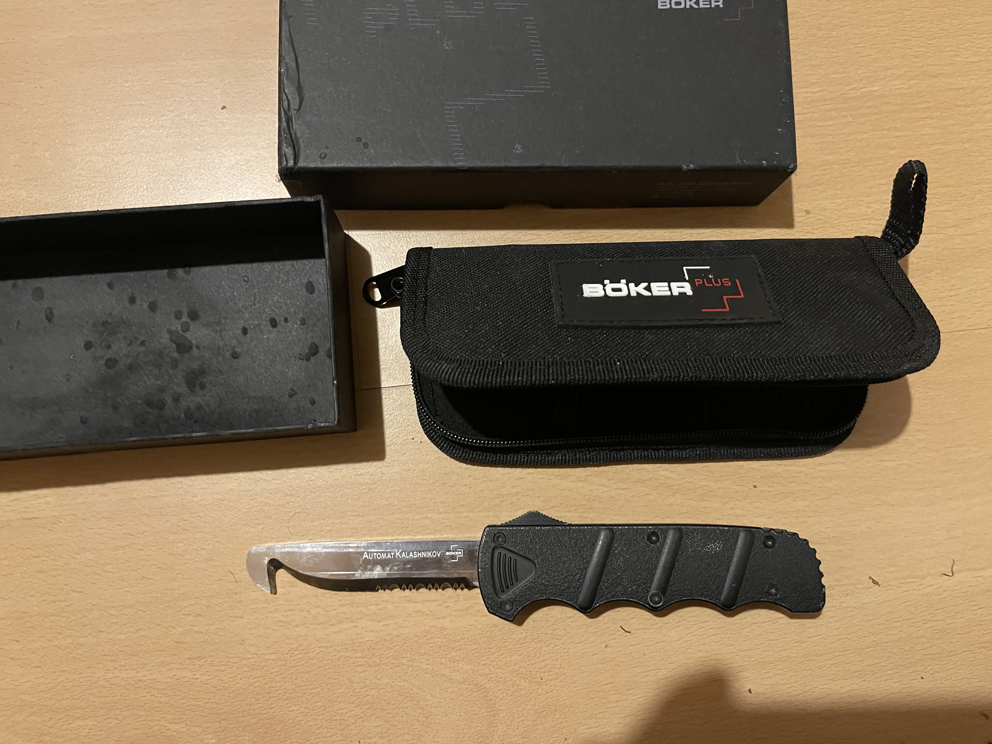 Das kalashnikov Rettungsmesser hat Gebrauchsspuren funktionsfähig ist es aber noch originalhülle hat leider einen Wasserschaden die Tasche ist hingegen neuwertig.