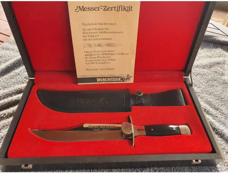 Zum Verkauf steht hier eine echte Sammler-Ikone: das Winchester Jubiläumsmesser „120 Jahre Winchester“ (1866–1986) in der seltenen Edition I – streng limitiert auf nur 300 Exemplare weltweit.