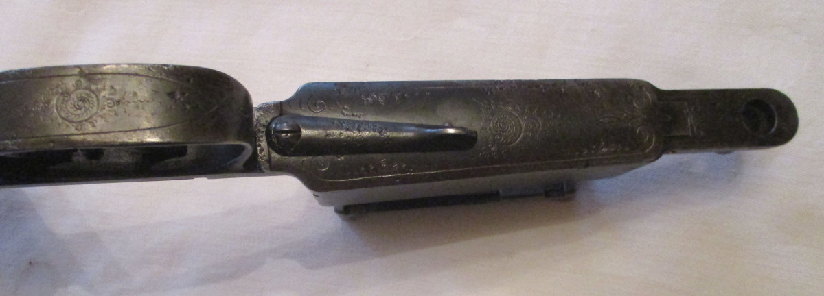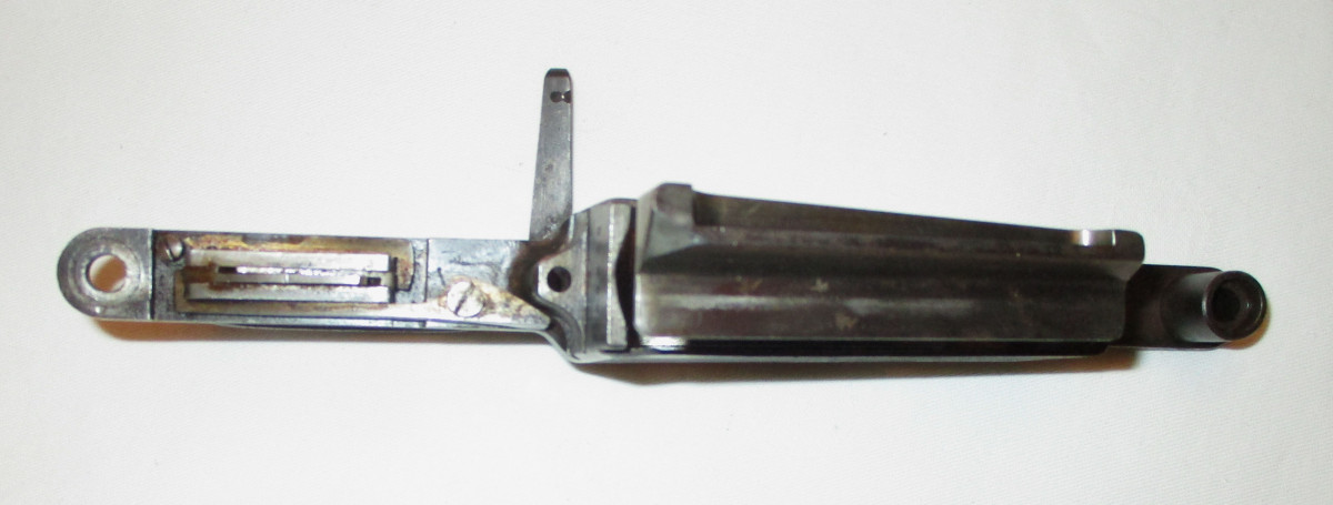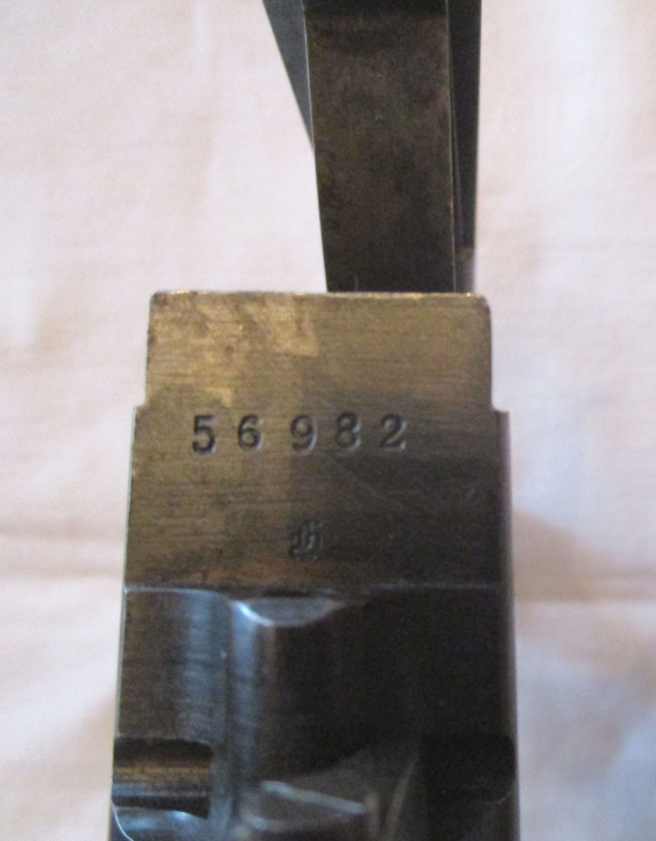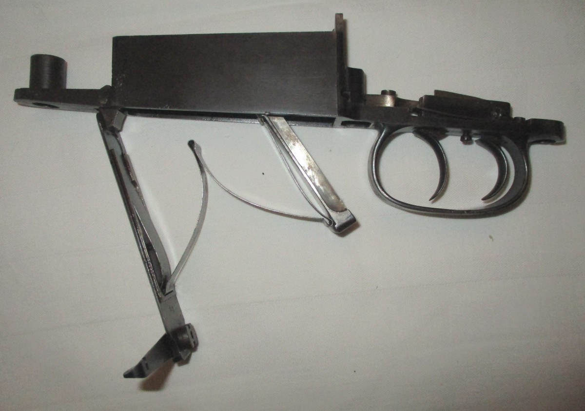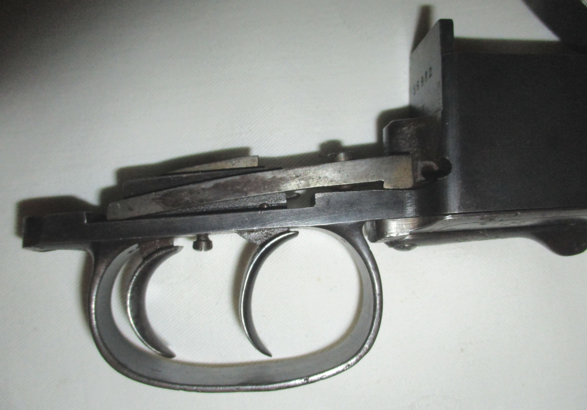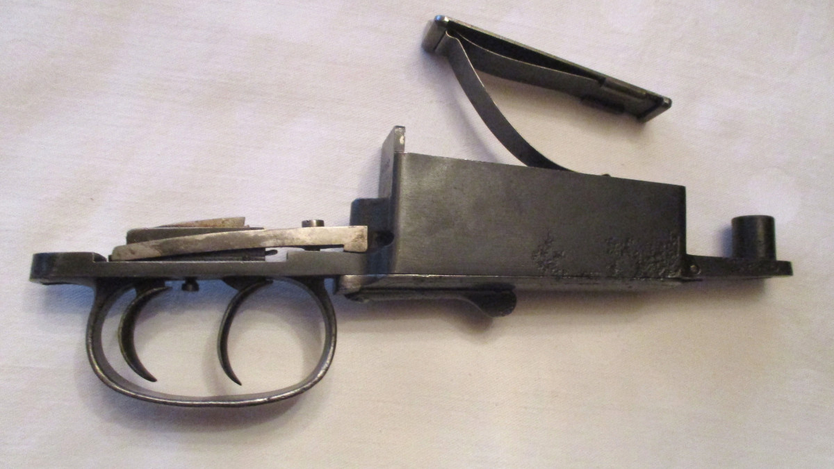 Abzugsbügel mit Magazinkasten für Modell 98. Jagdlich. Mit Gravuren, deutschem Stecher, Zubringer und Zubringerfeder. Selten; Der Magazinöffner, um das Magazin zu entleeren. Funktionsfähig, technisch in Ordnung.