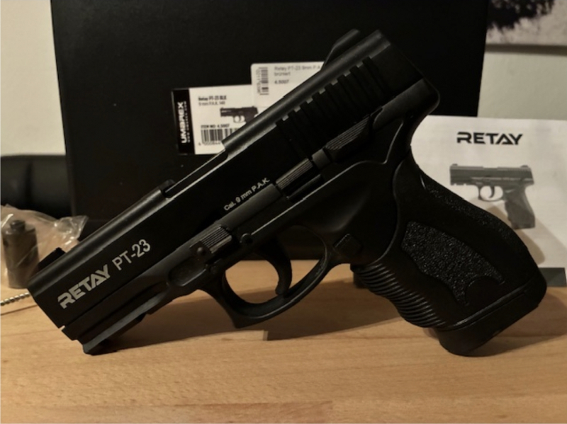 Verkaufe Retay PT-23 Schreckschusspistole 9mm P.A.K. brüniert. An Silvester ca. 50 Schuss mit Titan Munition abgegeben....ohne Probleme. Mehr wurde die Retay nicht beschossen. Neuwertiger Zustand ! Technisch Optisch Einwandfrei. Full-Set Versicherter Versand mit DHL Privat Auktion keine Garantie oder Rücknahme !!! Technische Daten: Hersteller: Retay Modell: PT-23 Farbe: Schwarz Kaliber: 9mm P.A.K. Magazinkapazität: 14 Schuss Länge: 181mm Gewicht: 795g Lieferumfang der Retay PT-23 Schreckschusspistole 1x Retay PT-23 9mm P.A.K. 1x Koffer samt Abschussbecher