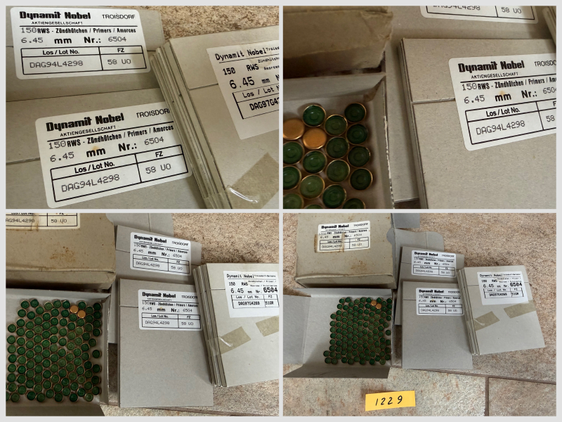 Sie bieten hier auf 5 Schachteln a 150 Stk. große Berdan Zündhütchen, Durchmesser 6,45 mm - RWS 6504. Insgesamt sind es also 750 Stk., dazu gibt es noch eine angebrochene Schachtel, siehe Foto.