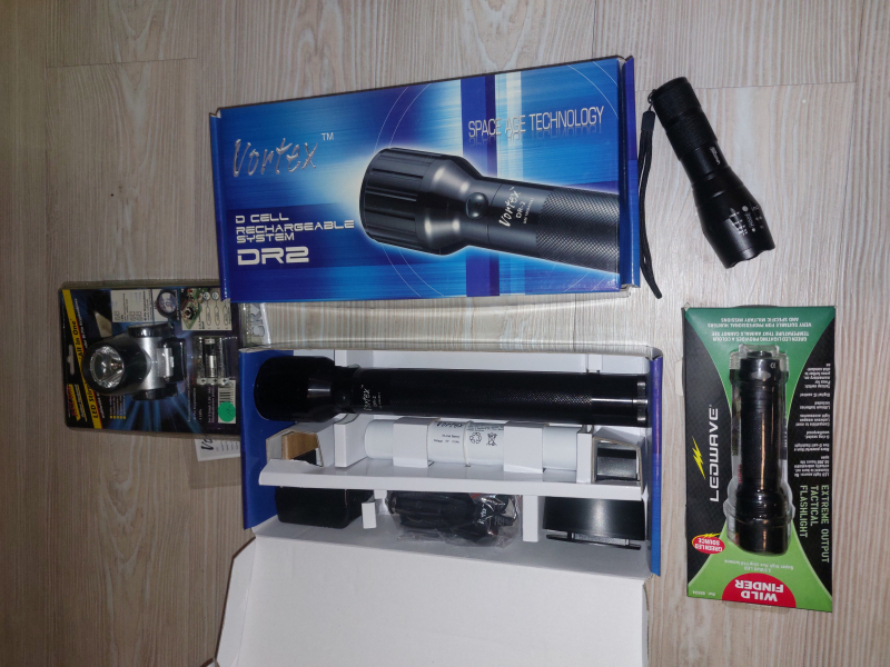 Taschenlampen Konvolut Kopflampe, 2 mit Akku, 2 Batteriebetrieb