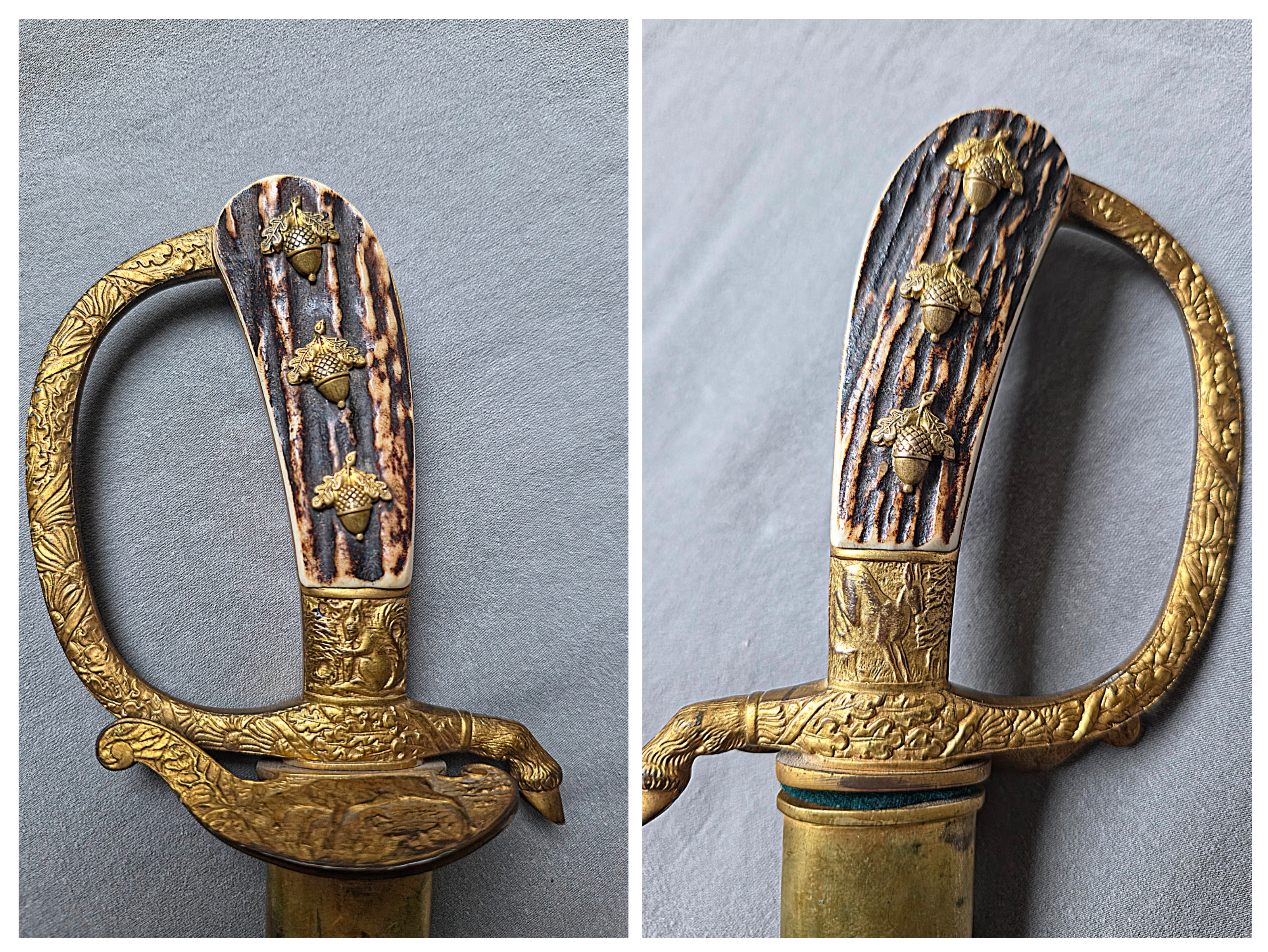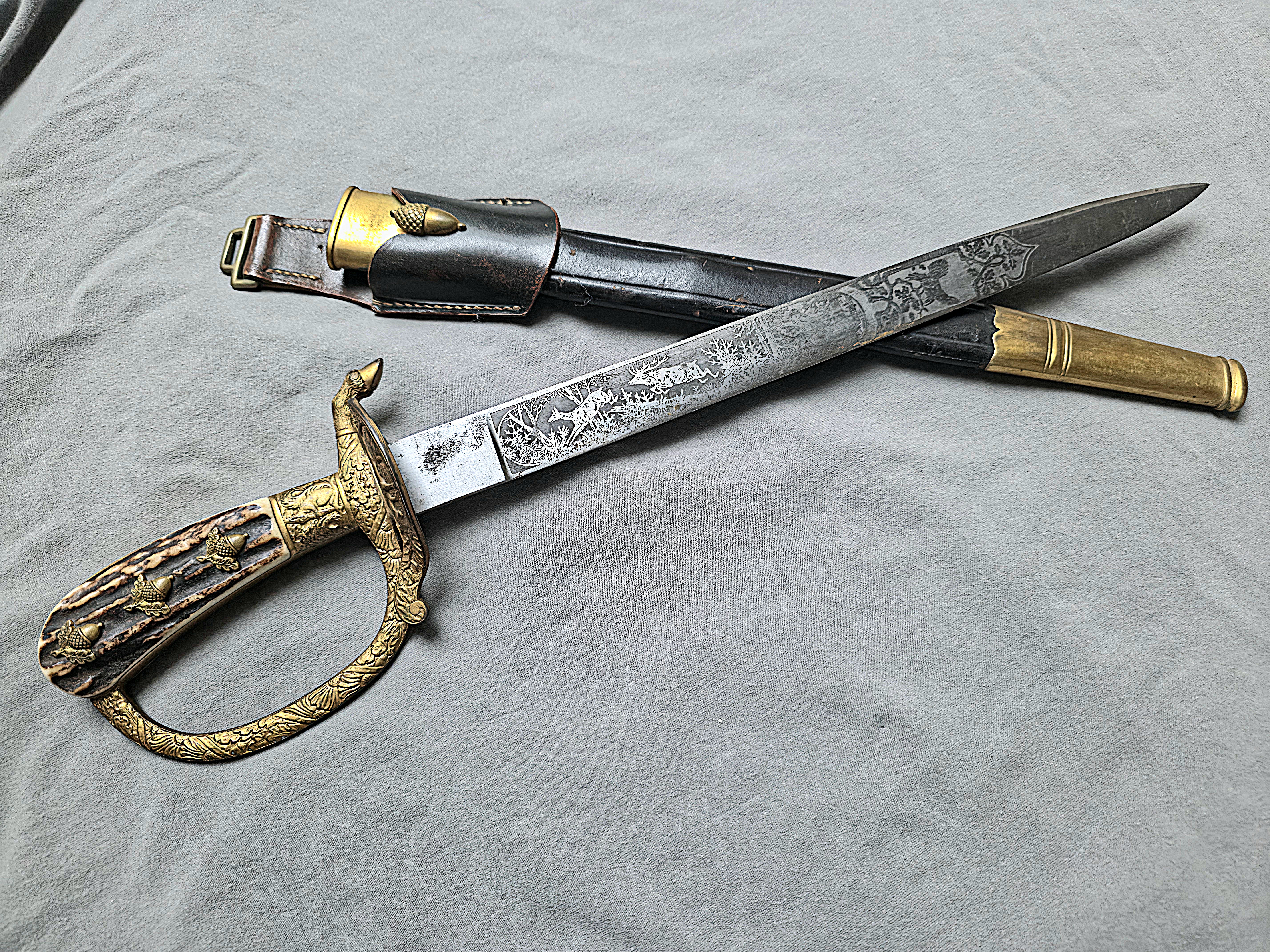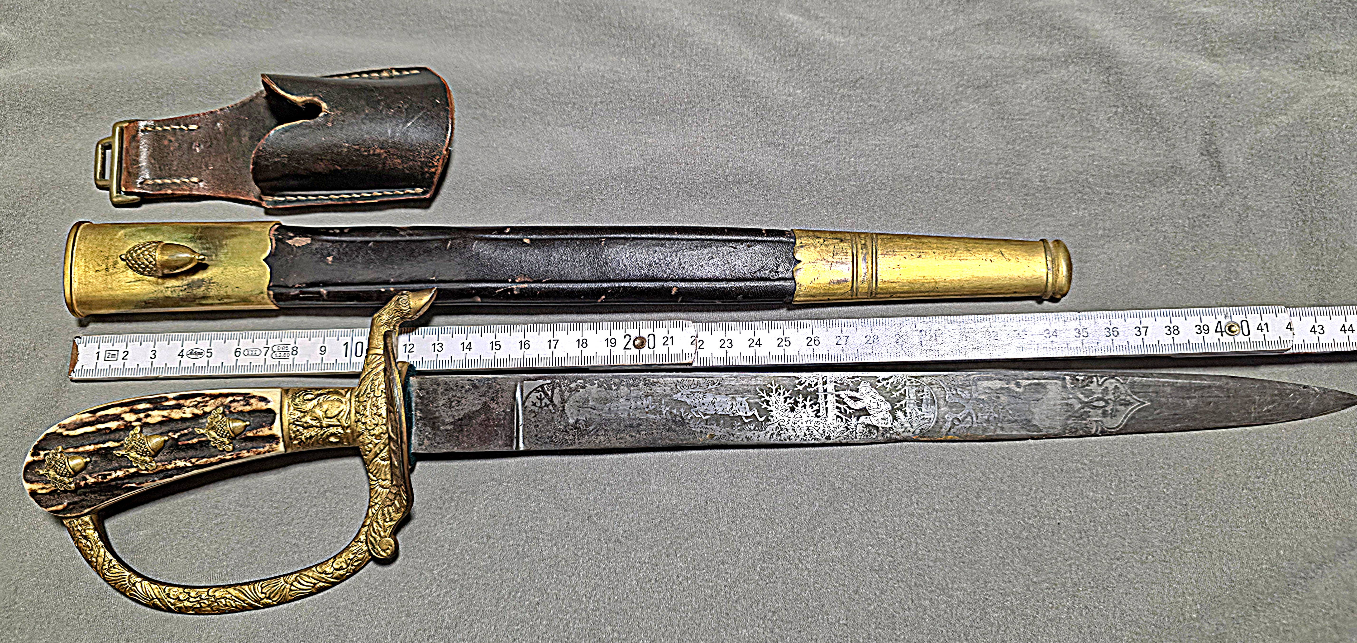 Original Eickhorn Solingen Ehrenhirschfänger Modell „Hubertus“, Fertigungszeit ca. 1935–1941. Repräsentativer Hirschfänger zur Uniform – kein Gebrauchsstück. Hochwertige Ausführung mit reich verzierter, vergoldeter Montierung, Hirschhorngriff mit Eichelzier sowie beidseitig fein geätzter Klinge mit Jagdmotiven. Das Herstellerzeichen „Original Eickhorn Solingen“ ist klar erkennbar. Klinge fest sitzend. Altersbedingte Gebrauchsspuren vorhanden, insgesamt sehr schöner und weitgehend original erhaltener Gesamtzustand ohne erkennbare nachträgliche Veränderungen. Originale Lederscheide mit Messingbeschlägen ist vorhanden. Der Hirschfänger stammt aus Familienbesitz und gehörte meinem Großvater, der in der ersten Hälfte des 20. Jahrhunderts als Förster tätig war. Maße entnehmen Sie bitte dem Bild. Privatverkauf aus Familienbesitz. Kein Notverkauf. Verkauf als historisches Sammlerobjekt. Altersnachweis erforderlich. Privatverkauf unter Ausschluss der gesetzlichen Gewährleistung. Versicherter Versand mit Sendungsverfolgung.