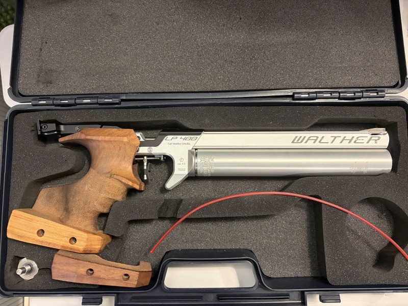 Artikelbeschreibung: Verkauft wird eine Walther LP 400 in Silber. Zustand siehe Bilder. Für mich ist die Pistole im sehr guten Zustand mit minimalen aber vorhandenen Gebrauchsspuren. Zum Beispiel durch Befestigung der Ausgleichsgewichte. Kartusche hat noch TÜV bis 02/32. Also man kann sofort loslegen und muss sich erstmal keine Gedanken machen. Die Waffe wurde wenig genutzt, da der Vorbesitzer nie so recht damit zurecht gekommen ist. Zusätzlich wurde die Waffe kürzlich vor ca. 1500 Schuss bei Walther Generalüberholt. Verkauft wird, wie auf den Bildern zu sehen. 1x Walther LP400 inklusive Kartusche TÜV bis 02/2032 mit Griffgröße L 1x Sicherheitsschnur 1x Waffenkoffer 1x Adapter für Kartusche 1x Griffverkleinerung professionell angefertigt von Griffgröße L auf ca. Größe M (somit 2 Griffe in einem integriert siehe Bilder) Keine Rücknahme oder Garantie bei weiteren Fragen einfach Anschreiben.