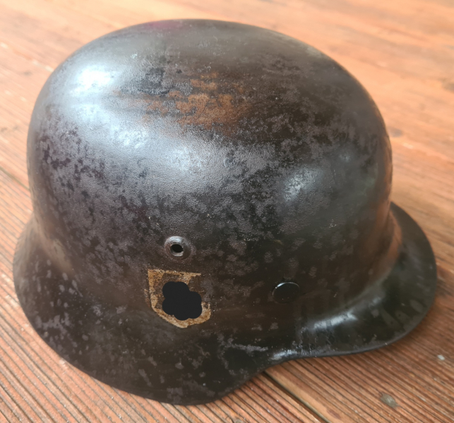Artikelbeschreibung: Original Stahlhelmglocke ET64. Lederfutter vermutlich erneuert, Alu Innenring original. Abzeichen auf beiden Seiten in recht gutem Zustand. Selten das beide Seiten erhalten sind. Sollte ein M35 oder M40 sein.