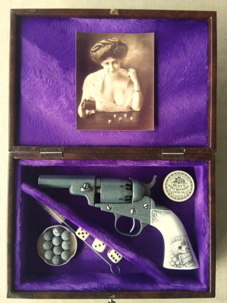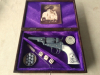 Seltenes Colt Pocket Modell mit Gravur und Scrimshaw-Griffschalen. Abschließbare Schatulle mit Inhalt wie abgebildet. Deko frei ab 18.
