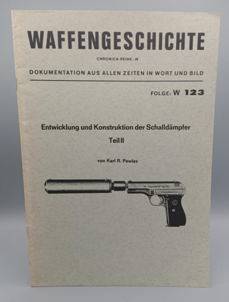 Zum Verkauf steht das Fachheft „Waffengeschichte Folge W 123 – Entwicklung und Konstruktion der Schalldämpfer Teil 2“. Die Ausgabe behandelt historische sowie technische Aspekte der Entwicklung von Schalldämpfern und richtet sich an Sammler, historisch Interessierte und Sportschützen.
