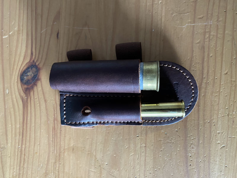 Vorderschaftetui aus Leder, sehr robust und gut verarbeitet. Fasst 12er wie 20er Patronen, die abgebildete Büchsenpatrone ist eine 7x65r. War an meiner ausrangierten BBF.