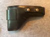Rechtshand, Lauf geschlossen, aus schwarzem Leder, mit dem eigenartigen Verschlussdeckel, der direkt mit der Gürtelschlaufe verbunden ist und der vorderen Magazintasche. Zustand gebraucht aber sehr gut für das vermutliche Alter, hier ein Blick auf der Rückseite mit Abmessungen