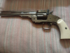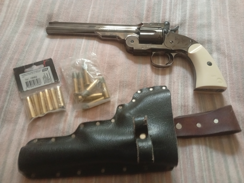 Wie fast alle meiner Waffen wurde der Schofield nach Erwerb einige Wochen geschossen und verschwand dann im Waffenschrank. Leider ist er nur noch fünfschlüssig, denn in einer Trommel ist ein Plastikmantel Diabolo beim Schuss auseinandergeflogen und die Reste des Plastiks kann ich nicht mehr entfernen. Deshalb sind auch die schwarzen Verfärbungen auf dem Foto keine Schmauchspuren, sondern Farbe um die Kratzer die bei meinen Versuchen die Trommel freizukriegen entstanden, zu überdecken. Ansonsten ist der Revolver einwandfrei Dazu gibt's 12 zusätzliche Hülsen und ein Westernholster aus Leder. Keine Garantie, keine Rücknahme und kein internationaler Versand.