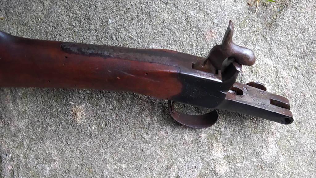 Metallteile sind aus Stahl (magnetisch) und ohne Rostnarben aber mit schöner Patina, leichter Flugrost war stellenweise (Schaftkappe vor allem) mal rauf. Die Teile haben teilweise gravierte Verzierungen, was auf eine zivile Nutzung hindeutet. Rest siehe Bilder.