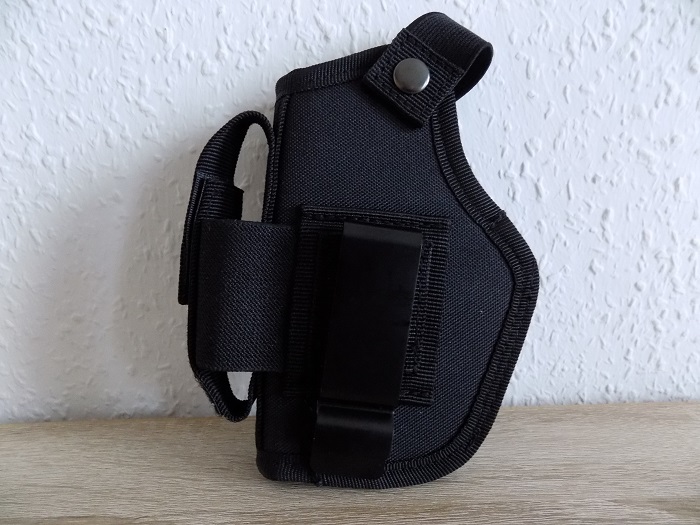 Das Holster ist 15 cm lang und 10 cm breit, unten offen so das die länge des Laufes keine Rolle spielt. Für einen sicheren Halt sorgt das elastische Druck-
