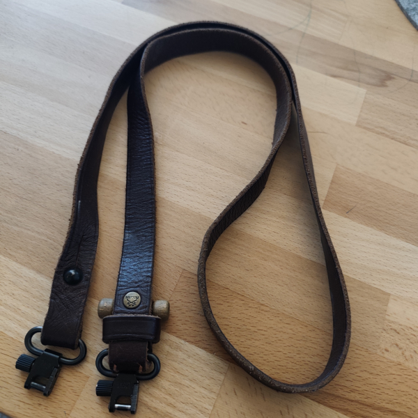 Gewehrgurt aus Leder mit Schnellverschluss.