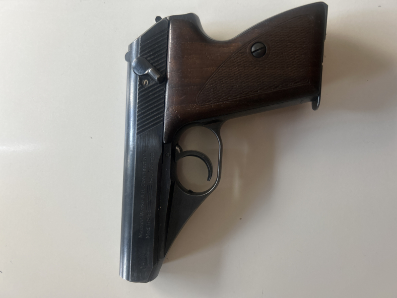 ich biete hier eine Mauser HSc im guten Zustand an mit den originalen Griffschalen . Beschusszeichen Adler über N. vor 1945. Lauf ist glatt und die Waffe ist nummerngleich.
