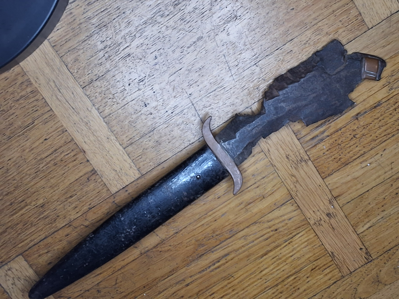 Biete hier orginale Grabenarbeit aus einem großen Granatsplitter aus dem 1 WK. Dolch in vielen Stunden wahrscheinlich im Feld gefertigt. Dabei war eine orginale Scheide von einem Grabendolch. Federklipp funktioniert und innere Feder auch. Gesamtlänge 26,5 cm. Privatverkauf ohne Garantie und Rücknahme. Auch Abholung bei mir zu Hause möglich.