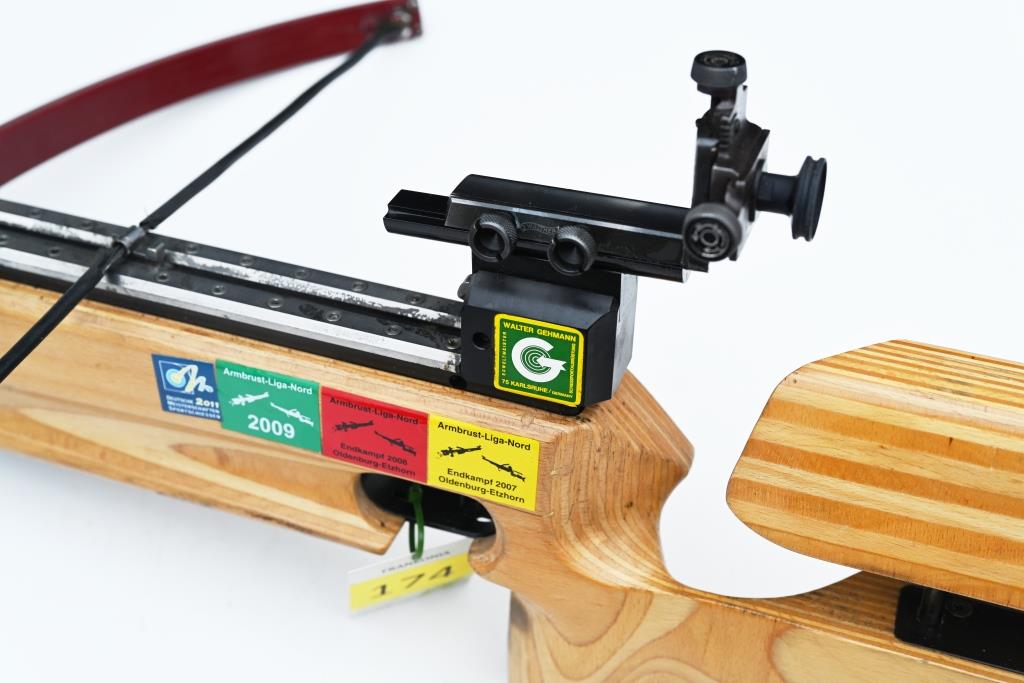 Hochwertige Armbrust, Match-Armbrust mit Tunnel- und Dioptervisierung, Bogenschleuder, Swiss-made Match-Crossbow aus Schweizer Spitzenfabrikation: