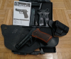 Schreckschusspistole mit Holz-Griffschalen, Ersatzmagazin, Abschussbecher, Koffer und zwei Holstern