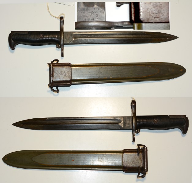 US Garand Bajonett 2. Weltkrieg, Klingenlänge 25 cm, gestempelt "F.H. UC MOD US 1943, mit Glasfiberscheide, guter Zustand