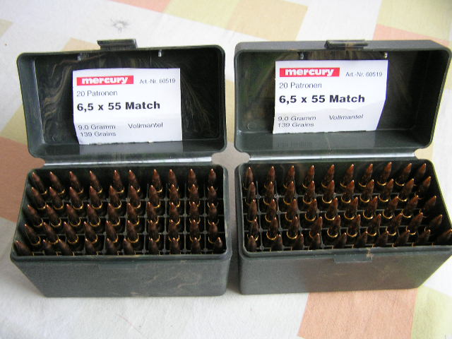 Ich biete 100 Stück Match Patronen Kaliber 6,5x55 mit 9,0 Gramm ( 139 Grains ) Vollmantelgeschoss zum Verkauf an. Die Patronen werden komplett mit Munitionsbox geliefert ! Die Munition wurde von Waffen Kettner unter dem Namen Mercury verkauft, Hersteller ist wohl Norma ! Die Patronen wurden kühl und trocken gelagert , sie stammen aus einem Los und sehen aus wie neu ! NUR gegen EWB !!! Realistische Preisvorschläge werden gerne angenommen !Privatangebot keine Garantie oder Rücknahme !!