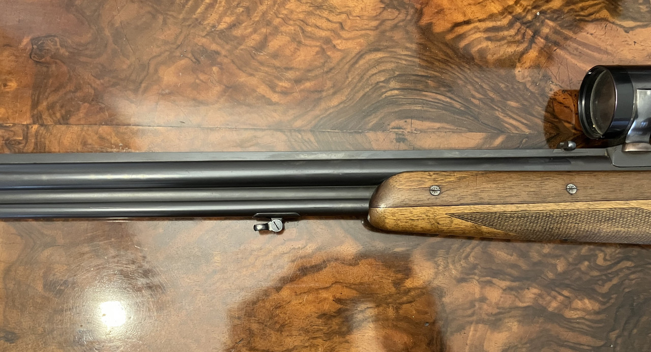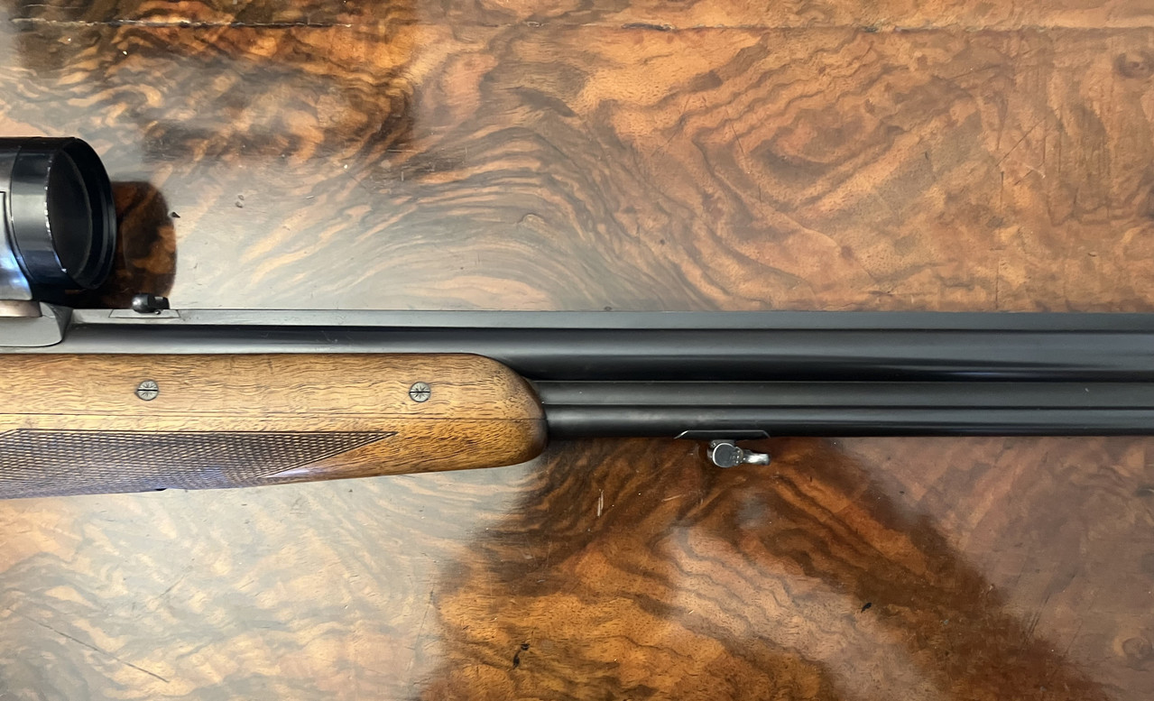 Versteigert wird die abgebildete Bockbüchsflinte von Gebr. Merkel in Suhl in der Kaliberkombination 16/70 und 7x57R. Auf der Waffe ist mit einer Suhler Einhakmontage ein Kahles HELIA Super 3-9x42 (Absehen 1) montiert. Wie auf den Fotos zu sehen ist, befindet sich die Waffe in einem guten Allgemeinzustand. Die Läufe wurden gut gepflegt. Die Züge und Felder des Büchsenlaufs sind scharfkantig. Die Schaftlänge beträgt ca. 36,5 cm. Der Verschluss schließt dicht ohne erkennbarem Spiel : - )