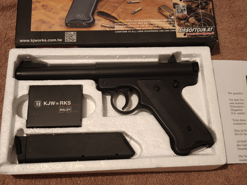 Biete eine KJWORKS Ruger MK1 Gaspistole 6mm BB, Zustand tadellos keinerlei Gebrauchsspuren lag nur im Karton, Funktion geprüft schießt einwandfrei, Pistole kommt im Original-Karton und mit Bedienungsanleitung, 40 eus inklu Versand innerhalb Deutschlands