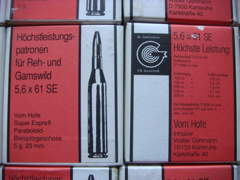 Sie kaufen hier 10. Patronen 5,6x61SE ( Super Express Paraboloidgeschoss mit 5g. Verbundkern von der Firma Walter Gehmann) . Alle Schachteln ( es sind 14. x 10 Patronen vorhanden ) sind noch original Verschlossen und in einem sehr guten Zustand !! Das ist ein Privatverkauf , daher keine Garantie , Umtausch oder Wandlung : Bieter aus dem Ausland müssen den Export selber organisieren über einen Deutschen Exporteur !!