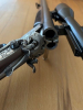 J.H. Damm Hahndrilling in sehr gutem Zustand , 5,6x50R Mag. und 20/70 Schrot ---------Zielfernrohr-----Hensoldt Wetzlar DIATAL 6x42 Abs.1 . 2 Schönheitsfehler hat der Drilling: 1 kleine "Macke" am linken Schrotlauf und eine "Markierung" am Gehäuse des Zielfernrohrs (beides auf den Bildern mit Pfeil markiert). Vorderer Abzug mit Stecher , sehr gutes Schussbild des Kugellaufes .