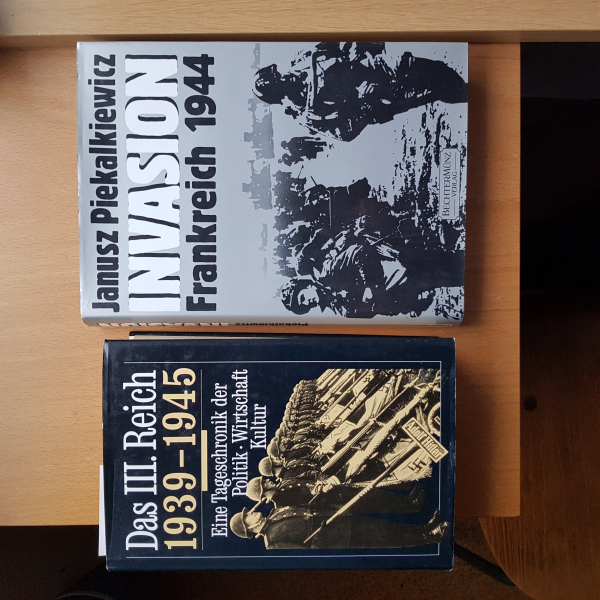 Sie bieten auf 2 Bücher. 1. Buch über die Invasion 1944 von dem bekannten Autor Piekalkiewicz. Viele Bilder. 2. Ein Tageschronik vom 01.09.1939 bis in den Juni 1945, es werden Ereignisse aus allen Bereich Tag für Tag aufgeführt. Die Bücher sind gelesen, aber in gutem Zustand, aus Nichtraucherhaushalt, keine Tiere, kein Kellergeruch. Paketporto wegen Gewicht. Privatverkauf zu den hier üblichen Bedingungen.