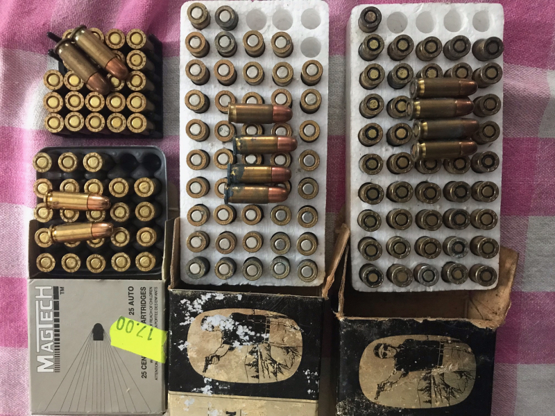 Von Privat aus einem Nachlass im Auftrag an EWB : 150 Patronen im Kaliber 6.35 : 25 Magtech - 25 Aguila ohne Verpackung - 50 S&B mit Oxidationsspuren - und 50 Remington ebenfalls mit Oxidation - eher Sammlerpatronen - ältere Fabrikpatronen. Von Privat, daher keine Garantie oder Rücknahme - Versandpauschale 6 Euro -
