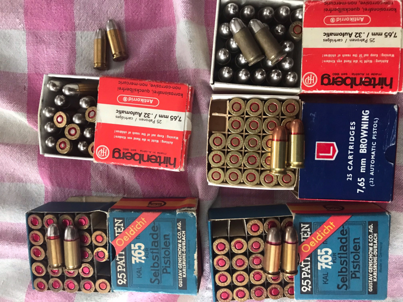 Von Privat aus einem Nachlass im Auftrag an EWB : 125 Patronen im Kaliber 7,65 bzw 32 Auto - 50 ältere Geco - 50 Hirtenberg mit teilweise leichten Oxydationsspuren und 25 Lapua - Fabrikpatronen. Von Privat, daher keine Garantie oder Rücknahme - Versandpauschale 6 Euro -