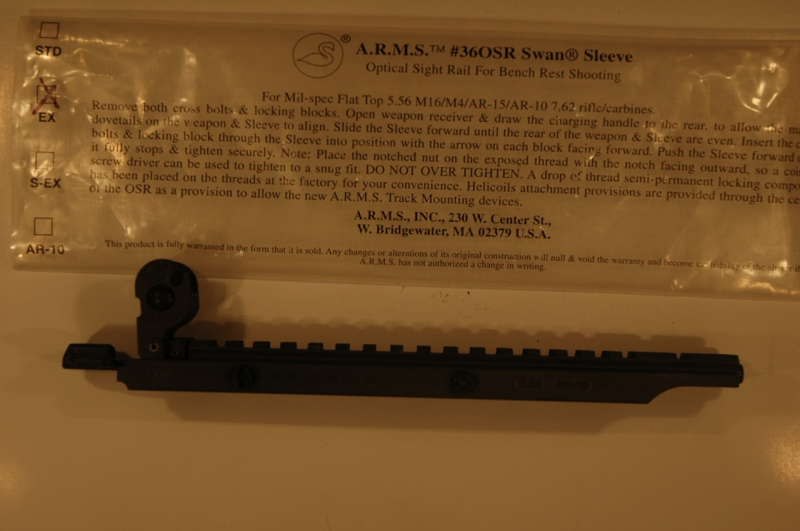 Aufschubmontage nach Mil-spec der Firma A.R.M.S. (sog. Swan Sleeve) für AR10 Waffen, wird auf die vorhandene Picatinny Schiene der Waffe geschoben und mit Schrauben verriegelt. Auf der Schiene sitzt hinten ein klappbares Dioptervisier. Gesamtlänge 25cm. Nur minimale Gebrauchsspuren, auf der Originalhülle sind Gebrauchsanweisungen gedruckt. Versand nur als Paket wg. Sendungsverfolgung. Bei Versand ins Ausland berechne ich aktuelle DHL Versandkosten – bitte Höhe für Ihr jeweiliges Land erfragen. Privatauktion, daher keine Gewährleistung und keine Rücknahme.