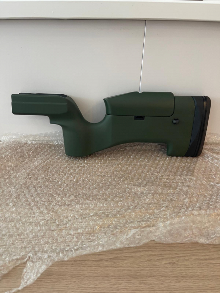 Original SAKO TRG Hinterschaft in grün. Neu, komplett mit Backe unbenutzt. Original Verpackung. SEHR SELTEN!