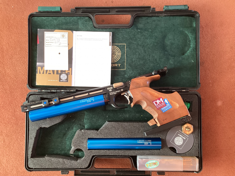 Auflageplatte. Zwei Kartuschen, eine bis 2029, die andere bis 2030 verwendbar. Dabei sind vier Steyr Zusatzgewichte a‘10 Gramm. Die Bedienungsanleitung , das Werzeug und der Fülladapter sind auch dabei.