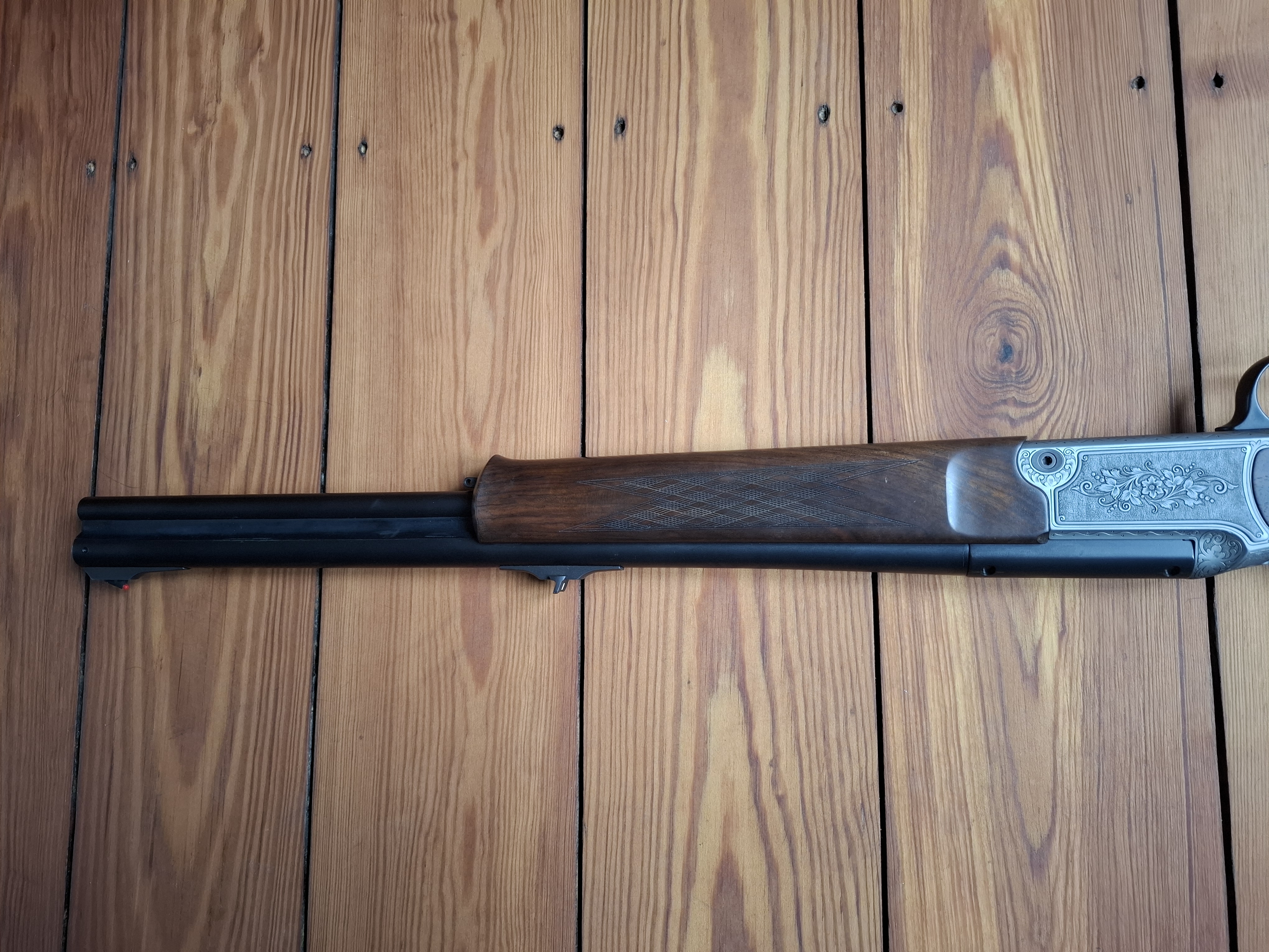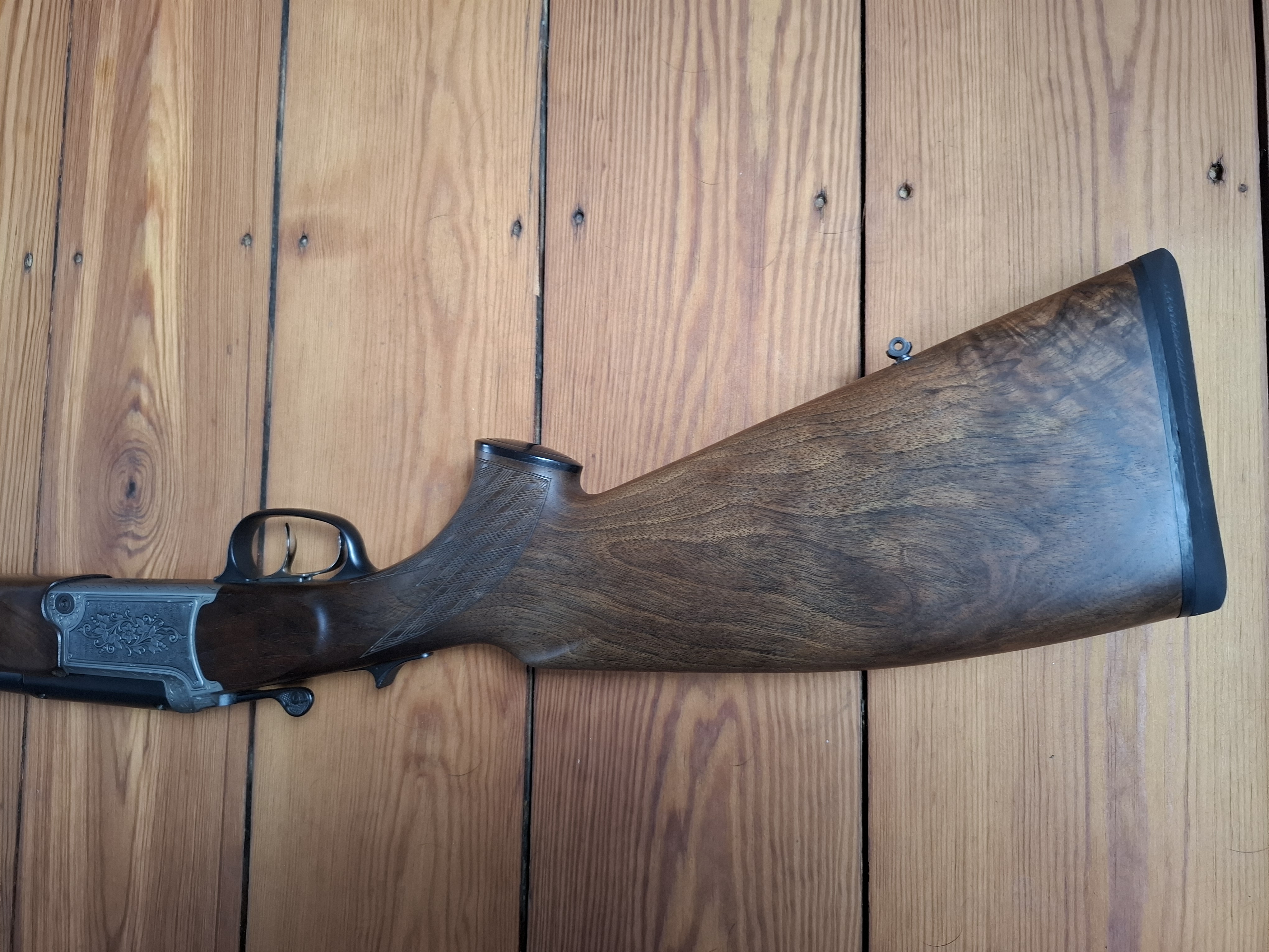 Ich verkaufe hier wegen Überbestand meine Blaser Bockdoppelbüchse BB97 in der Ausführung Prestige im Kaliber 9,3x74R mit Doppelabzug. Die Waffe ist in einem insgesamt sehr guten Zustand und wurde jagdlich geführt. Der Schlossgang ist fest, die Läufe sind blank. An der Unterseite des Vorderschaftes sind ein paar flache Kratzer, s. Bild.