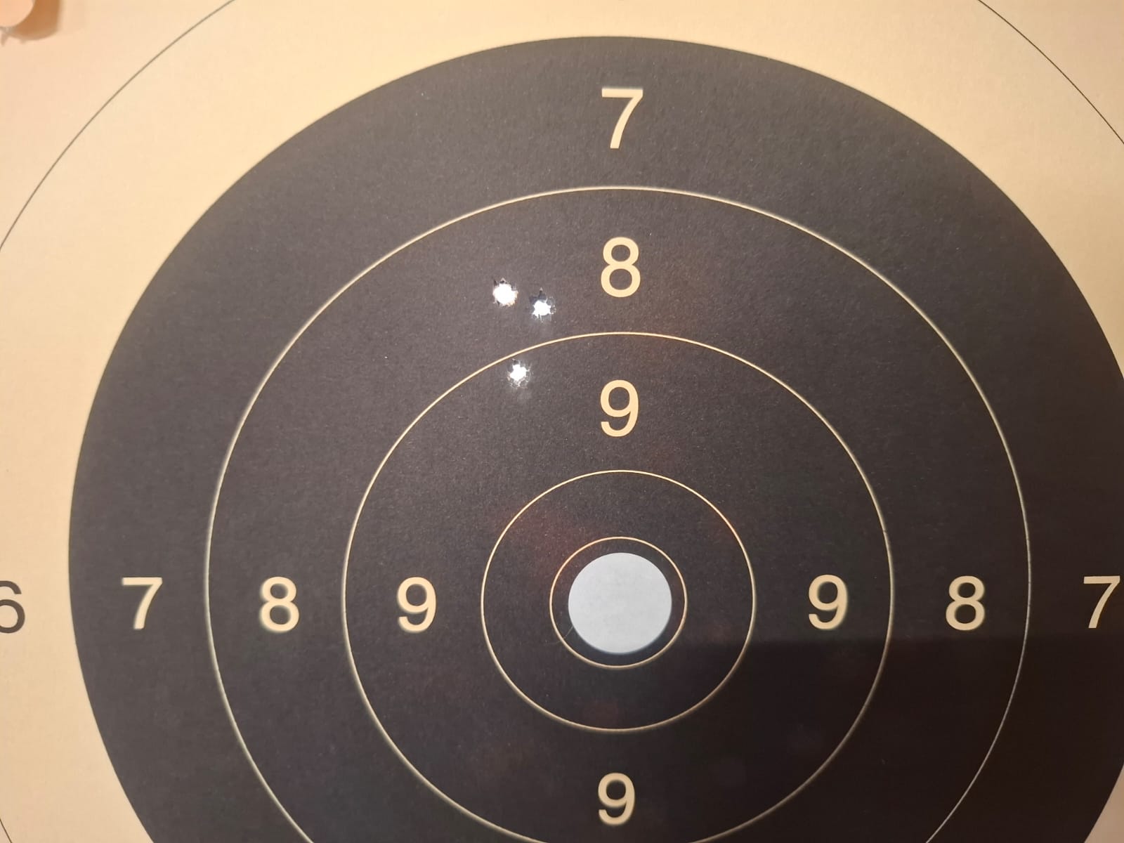 Die Schussleistung ist sehr gut, s. Bild (Hornady XTP, 20 grain, 100 Meter). Die Treffpunktlage mit dem CCI Gamepoint 20 grain und dem Hornady V-Max 17 grain ist praktisch gleich.