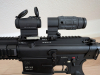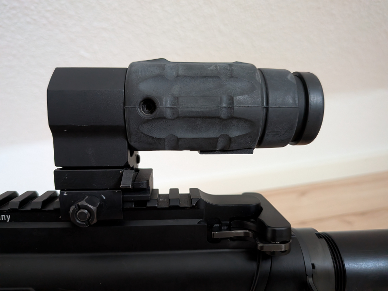 Original AIMPOINT 3x Magnifier mit Montage für Picatinny-Schiene, die sich sowohl zur Seiten klappten (Flip) als auch abnehmen lassen kann (Twist). Es handelt sich um ein militärische Optik, die höchsten Beanspruchungen standhält.