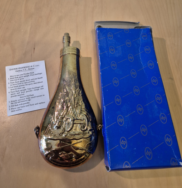 neuwertige Pulverflasche aus der Colt Signature Series für Colt Walker, Whitneyville Walker oder die Dragoon Modelle. Die Pulverflasche ist durch die lange Lagerung lediglich etwas angelaufen. Sie ist natürlich mit der Sam Colt Signatur versehen und wurde von Davide Pedersoli in Italien für Colt produziert.