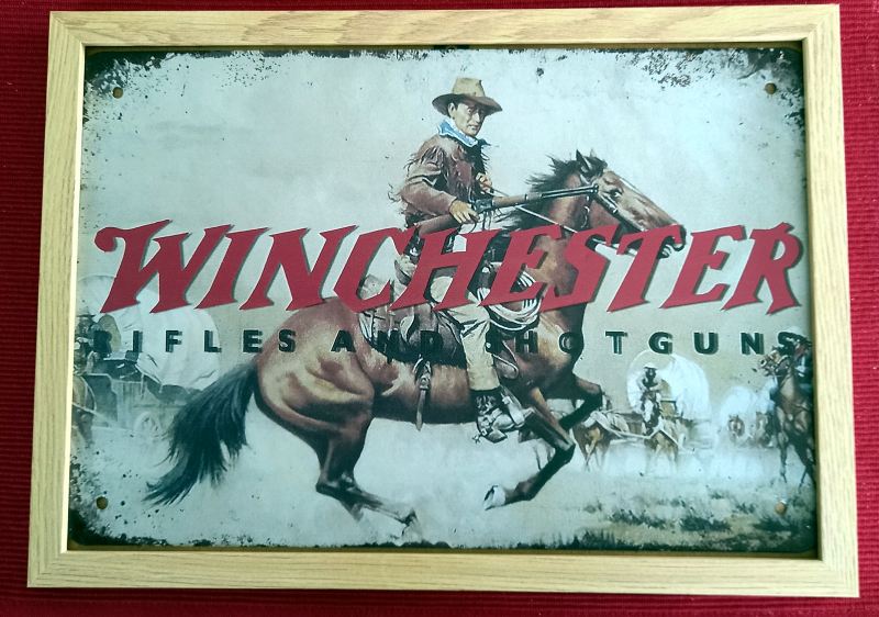 Biete Blechschild Winchester auf Holzrahmen. Rückseite mit Bildaufhänger. Maße 32 x 23cm. Privatverkauf! KEINE Rücknahme!