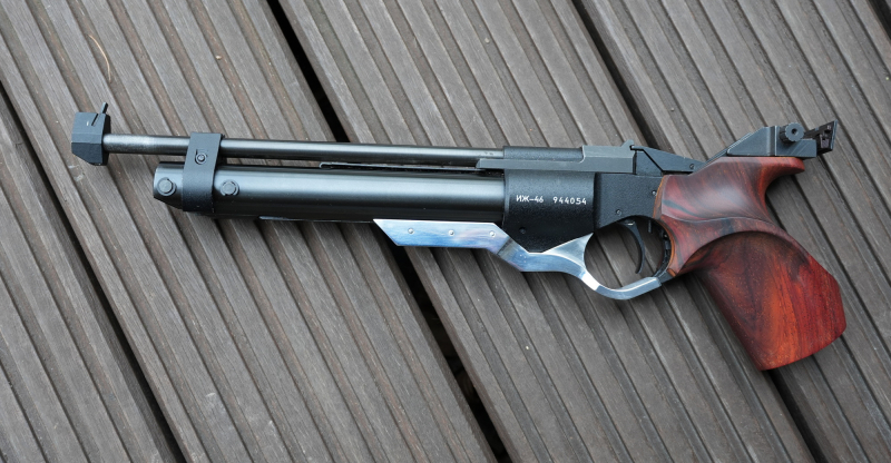 Russische Druckluft Matchpistole IZH-46 im Kaliber 4,5mm. Die IZH-46 ist ein Einzellader und geschossen wird mit vorkomrimierter Luft.
