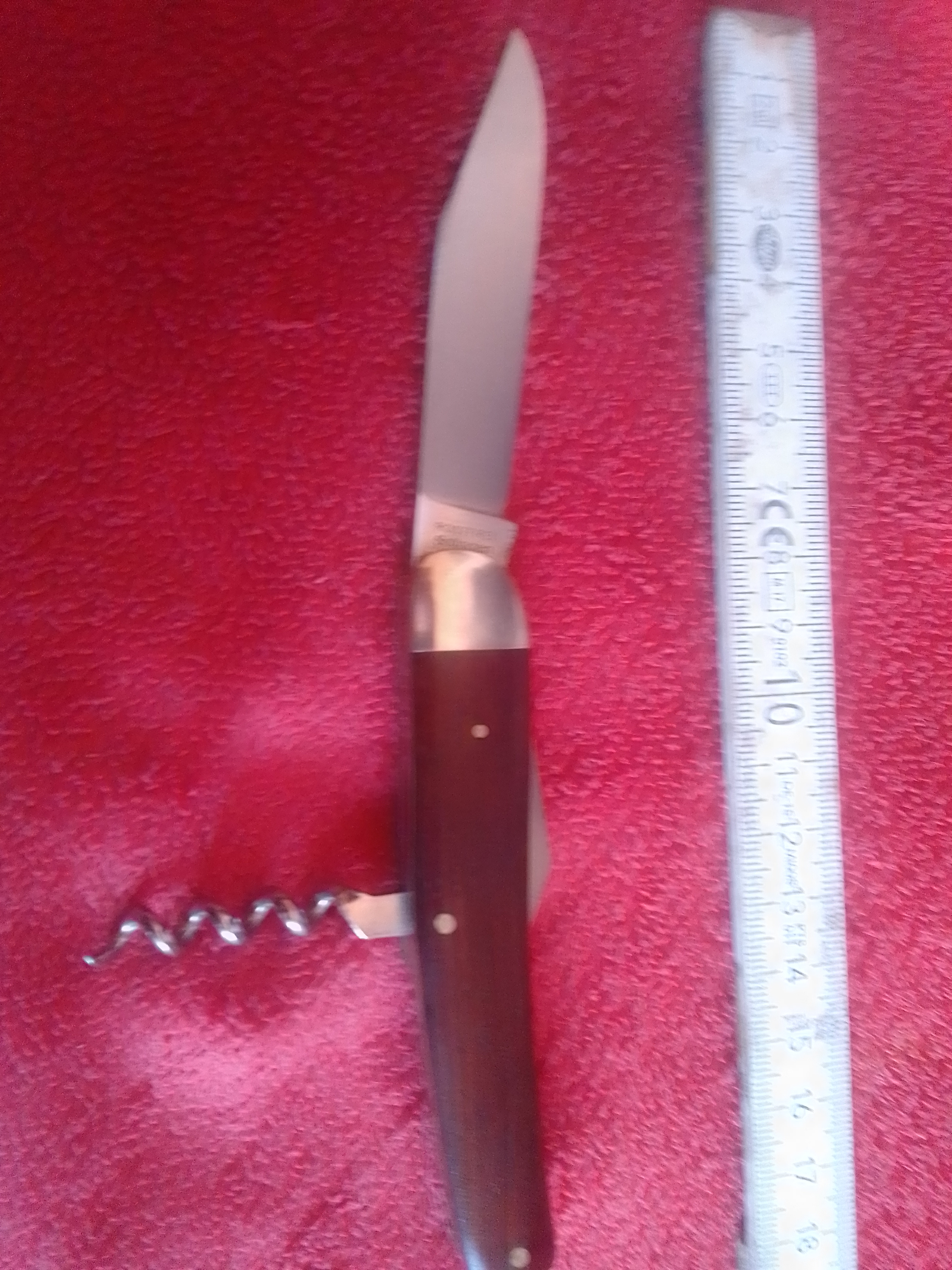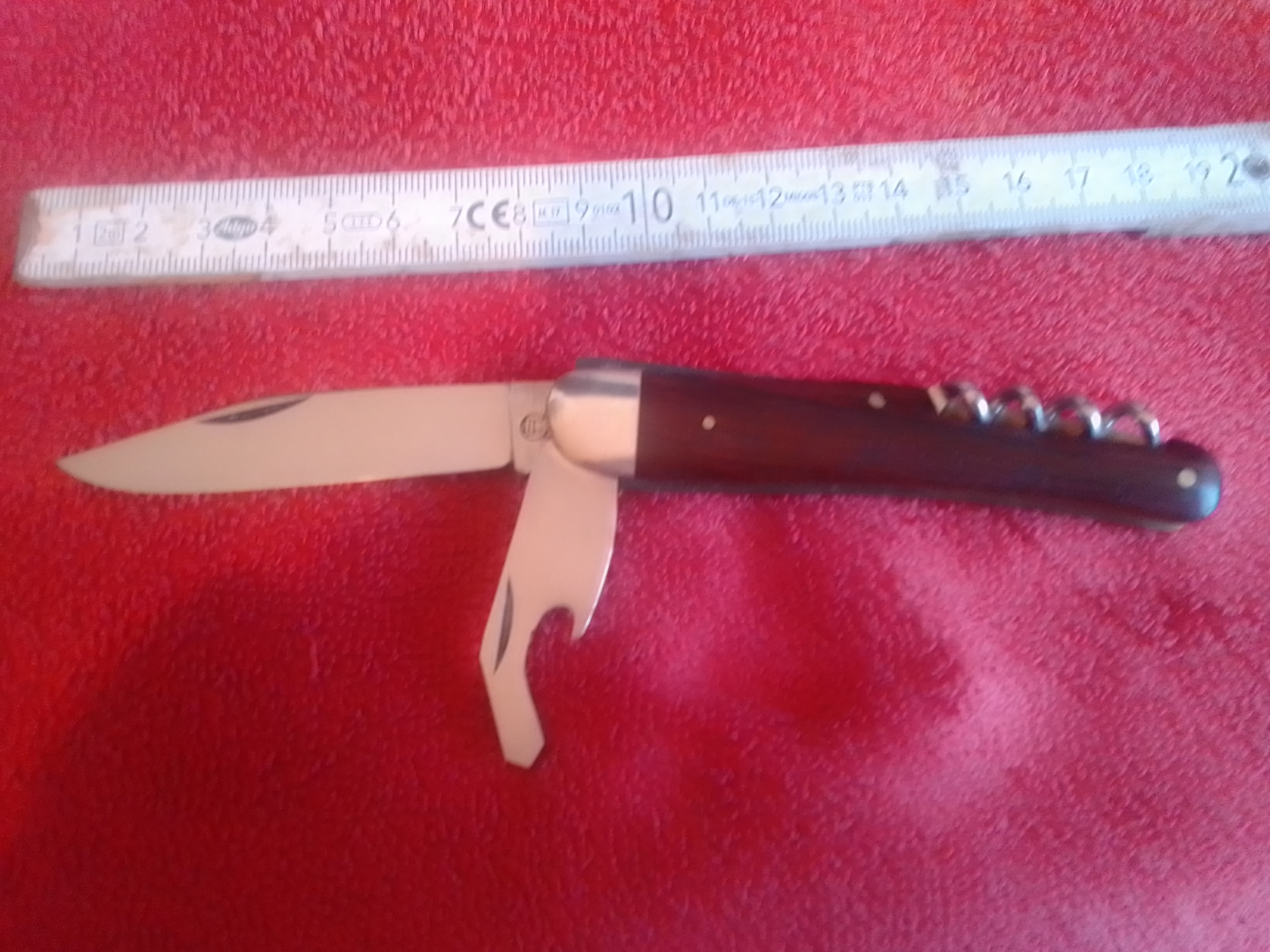Gesamtlänge 18 cm, Klinge: 7,8 cm, incl. Kapselheber/Schraubendreher und Korkenzieher.