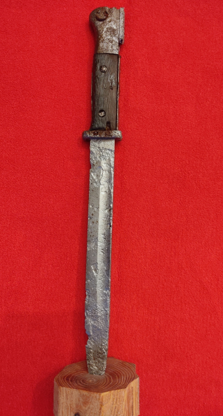 Gereinigtes Bajonett Bodenfund. Es ist alles fest nichts wackelt. Gesamtlänge: 38 cm, Klingenlänge: 24,5 cm , Klingenbreite: 2,5 cm. Inklusive Standholz.