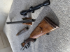 Ich verkaufe einen Bockdrilling von Franz Sodia Ferlach.Kal.8x57 IR, 5,6x35 R Vierling, 16/70, Auf der neu aufgebauten Schwenkmontage ist ein Hertel&Reuss 2 3/4-10 x 50 Absehen 1 montiert. Der doppelte Laufhakenverschluss mit Greener wurde neu gedichtet und der Schaft mit deutscher Backe ebenfalls überarbeitet. Am Hinterschaft wurde die Fischhaut nachgeschnitten. Schaftlänge 35,5 cm, Lauflänge 60 cm. Mündung verlötet.