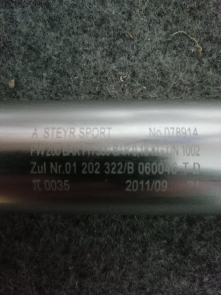 Zur Versteigerung kommt eine Steyr-Druckluftkartusche mit integriertem Manometer, Silber, 19cm. Datum 9/2011, Abgelaufen 2021.Nicht für den Wettkampf zugelassen. Nur für Freizeit und Hobby. Kein Druckverlust, guter Zustand und voll funktionsfähig. Versand als unversichertes Päckchen.
